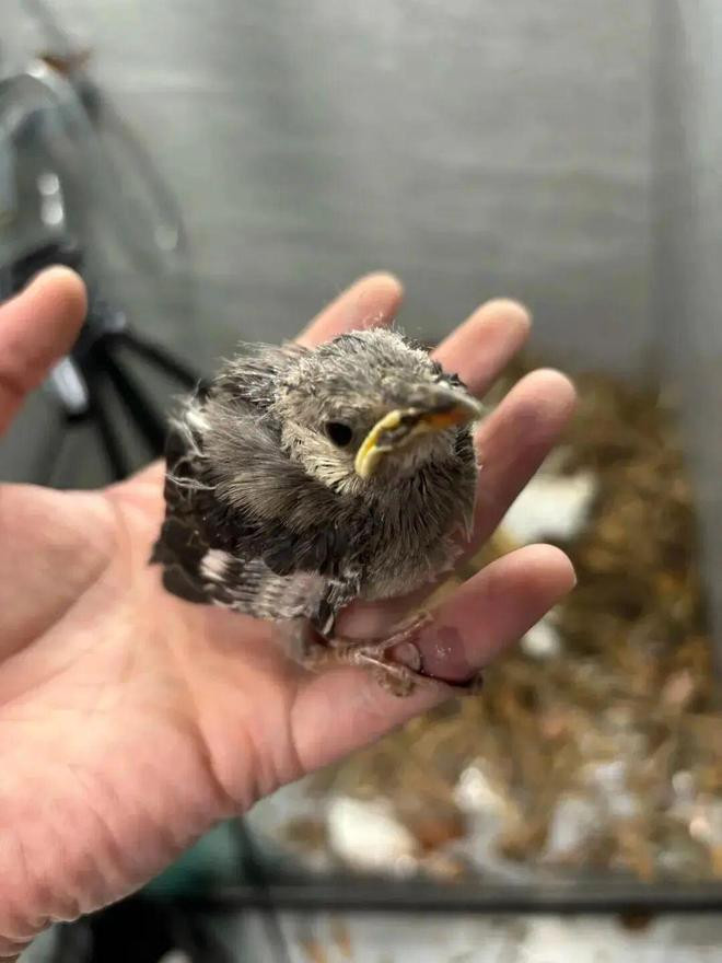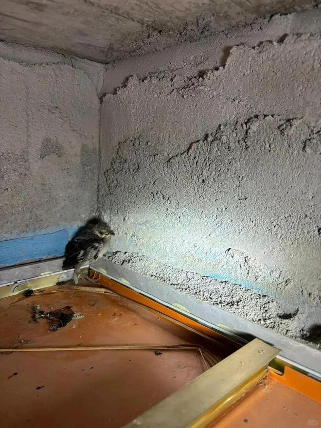 等将其全部掏下来后,站在梯子上往棚顶里面一看,一只小黑鸟正满脸懵逼,躲在墙角瑟瑟发抖。